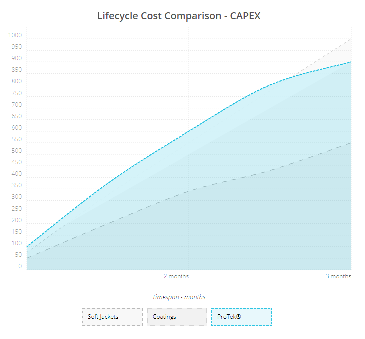The above graph shows the CAPEX cost comparison between intumescent coatings, soft jackets and ProTek®.