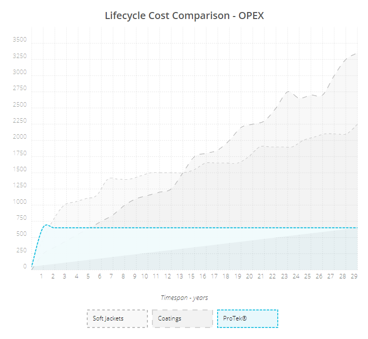 The graph below shows total cost of ownership over a 30 year period. This clearly shows the effect of the inspection, maintenance, repair and replacement cycle required of coatings and soft jackets. There are no such requirements for ProTek® system so the operating costs are zero yielding a much lower lifecycle cost over the platform life.